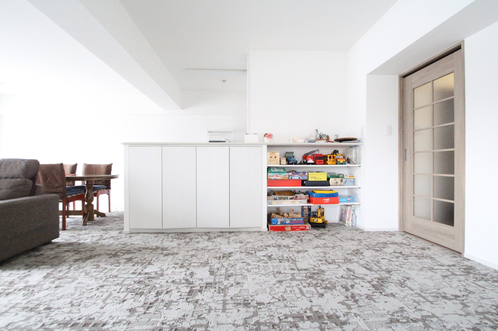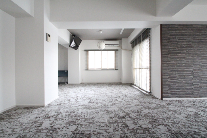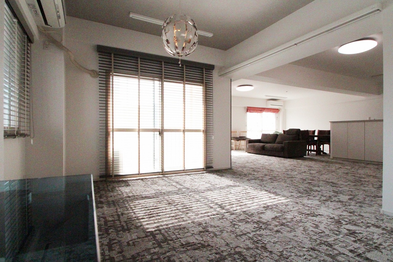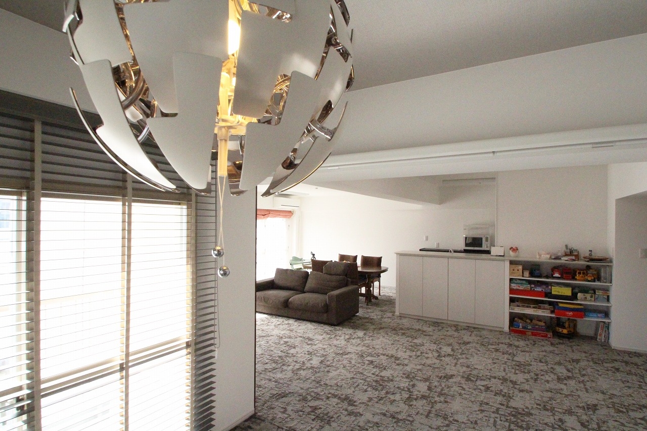 固定の間仕切りを最小限にする思い切った空間作りをご提案させていただき、改修前は細かく区切られていた各居室の間仕切りを取り払うことで、緩やかなゾーニングの開放的なリビングスペースを実現しました。