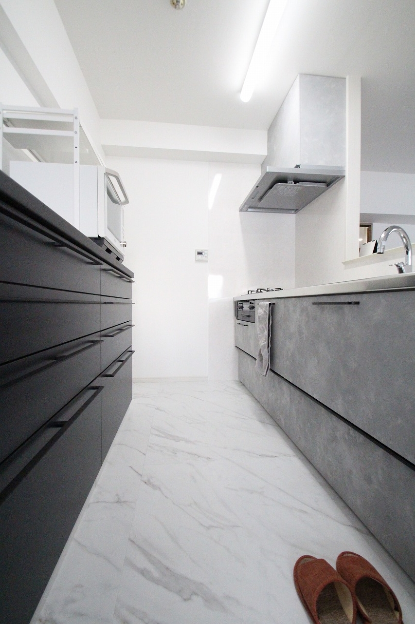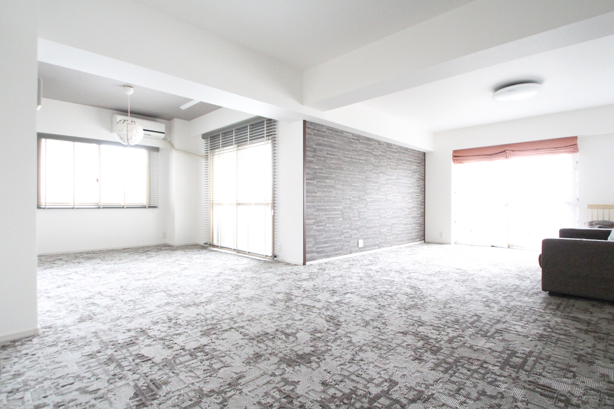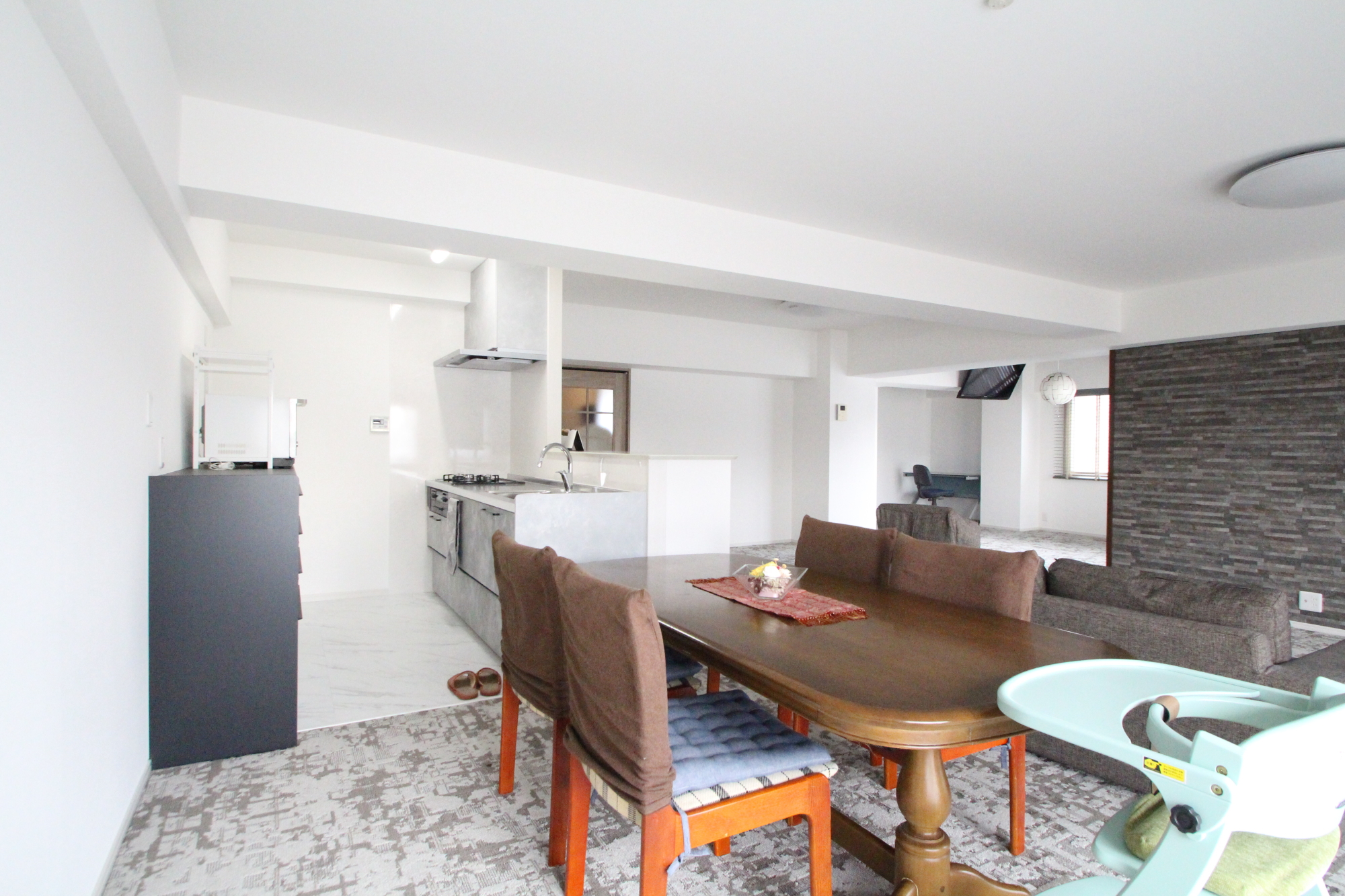 固定の間仕切りを最小限にする思い切った空間作りをご提案させていただき、改修前は細かく区切られていた各居室の間仕切りを取り払うことで、緩やかなゾーニングの開放的なリビングスペースを実現しました。